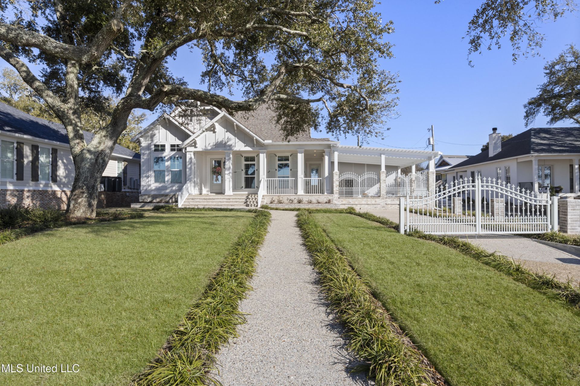 Stunning beachfront bungalow located on a prime corner lot with expansive oak trees and beautiful Gulf views. The home features soaring high ceilings throughout, with a study offering over 12' ceilings and a direct Gulf view. The living room showcases a panoramic Gulf view, complemented by a covered porch that wraps around the front and side of the home. The kitchen seamlessly opens to the living area and breakfast nook, creating a perfect open-concept space. The spacious primary bedroom is located on the first floor and includes custom-built ins. The en-suite bathroom offers dual vanities (a double-sink vanity and a single vanity), a large shower, and a customized walk-in closet. Additionally, there is a half bath and laundry room downstairs. The kitchen is equipped with top-tier appliances, including a walk-in pantry, custom refrigerator, gas cooktop, and an island with bar seating. This home is also equipped with a custom security system, plantation shutters, built-in cabinetry, new light fixtures, and offers three additional bedrooms, a small den, and one bathroom on the upper level. There is potential to add a third bathroom if desired. Additional features include a full gas generator, gutters and downspouts, extra parking next to the double garage, and a custom enclosed outdoor covered patio with an outdoor kitchen, commercial hood, grill, and fireplace with a gas starter. The outdoor kitchen area is complemented by a covered patio with a Gulf view, featuring an RV-rated clear roof with three layers and a 4'' insulated roof. The professionally landscaped yard is equipped with a sprinkler system and finished with brick and powder-coated railings. Schedule your viewing today!